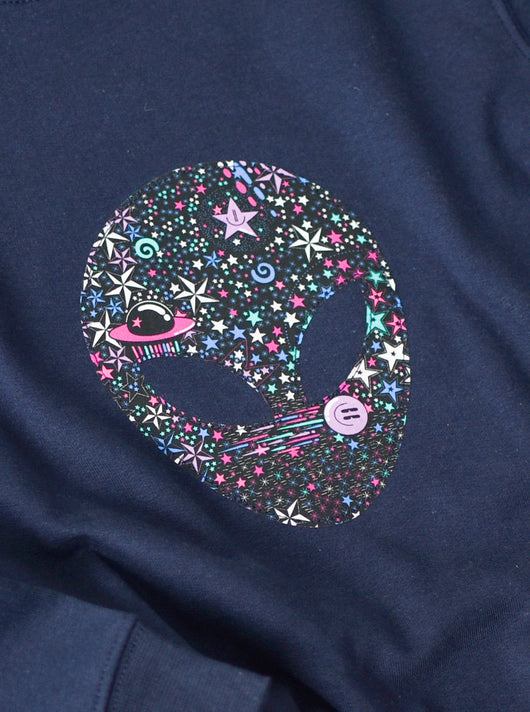 This playful alien head appliqué sweatshirt is made with the exciting 'Adelajda in Space' print, showcasing flying saucers, stars, and large googly eyes for a quirky touch.